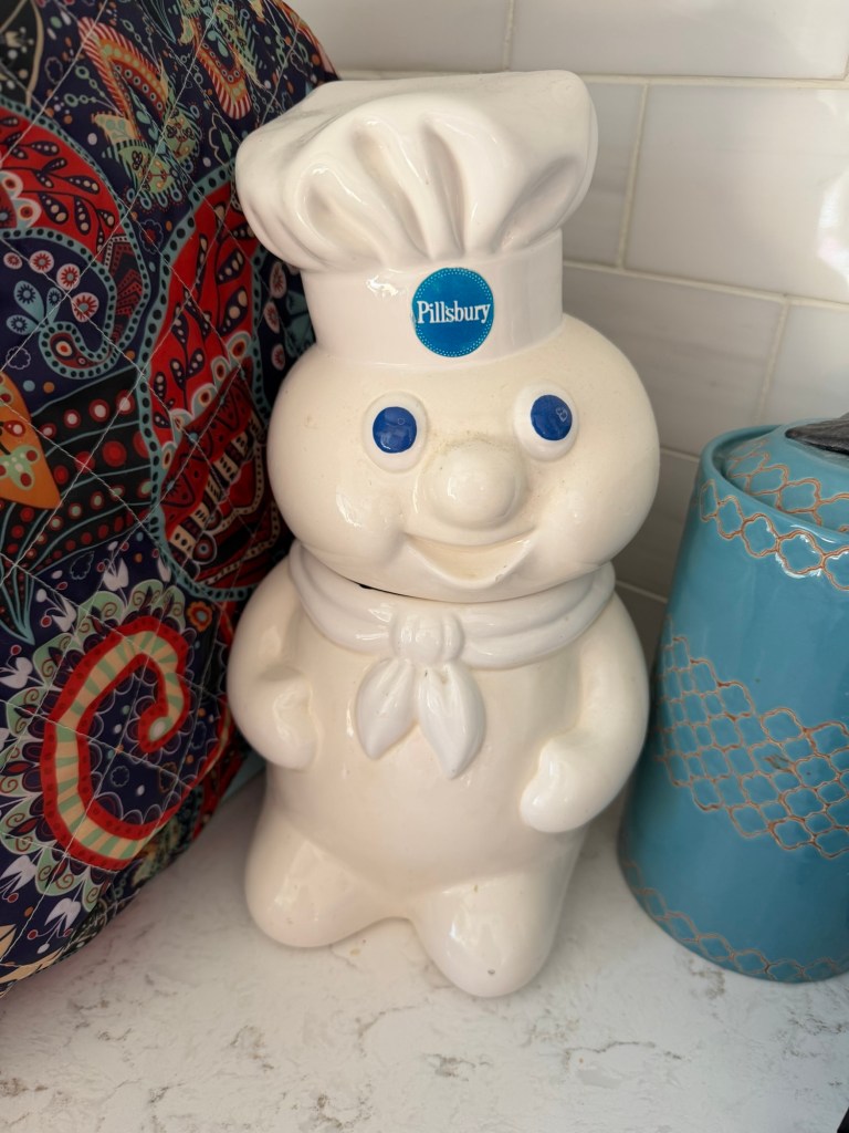 One of those treasures eventually followed me home and ended up in my kitchen… a Pillsbury Doughboy cookie jar that honestly looks like it has seen some shit.